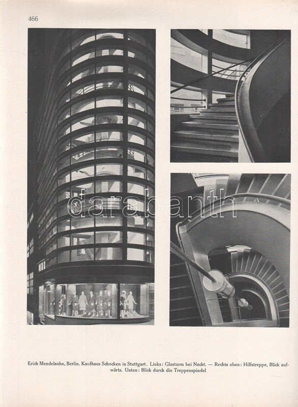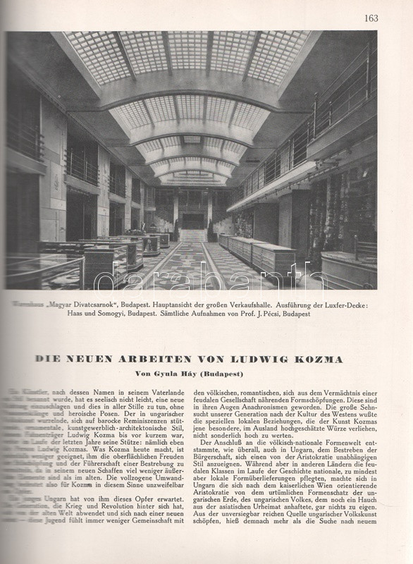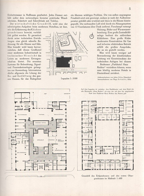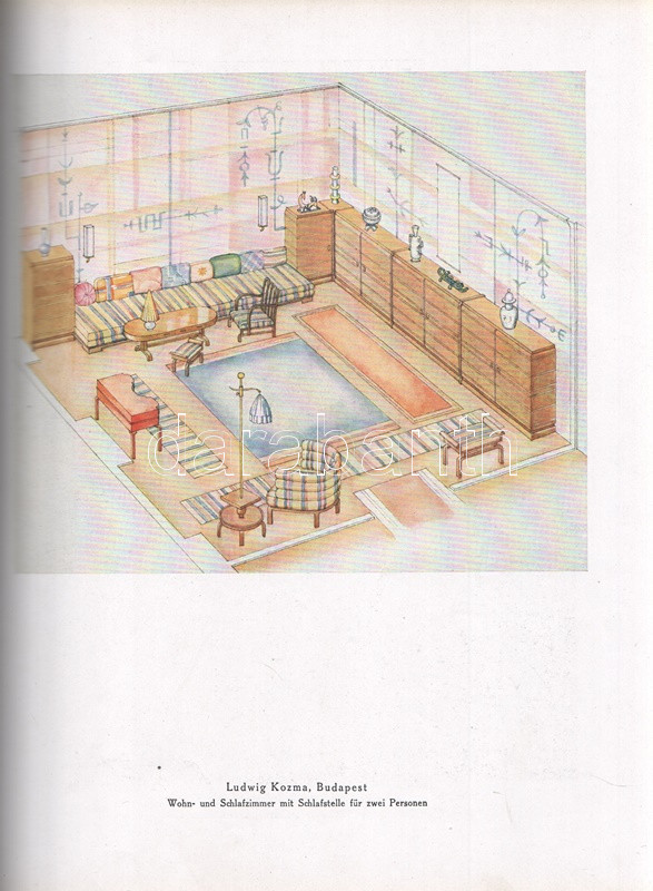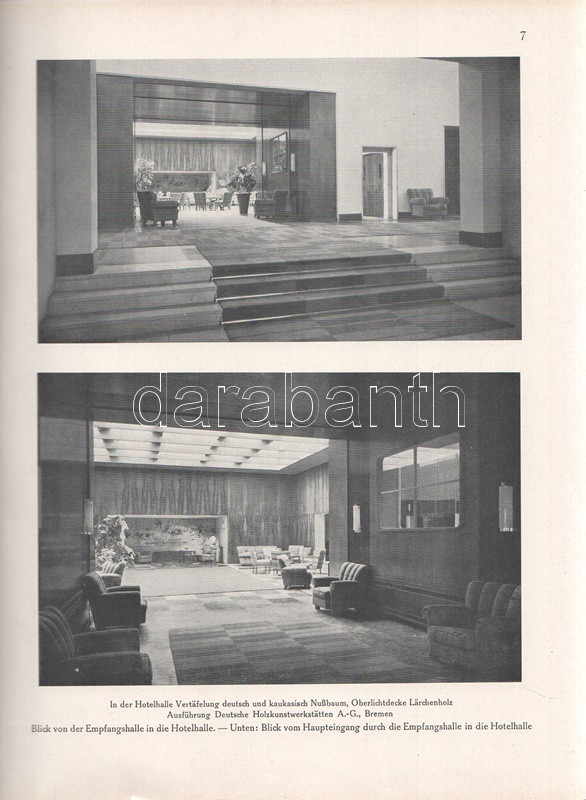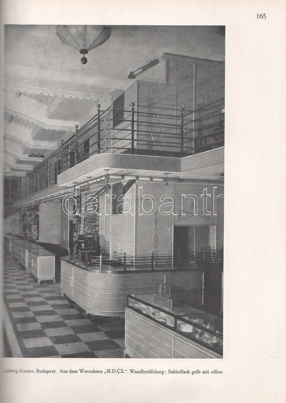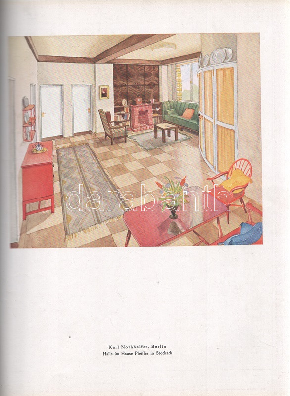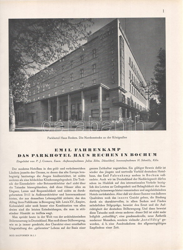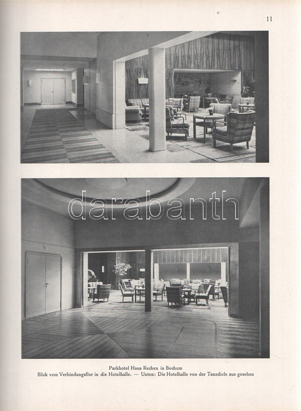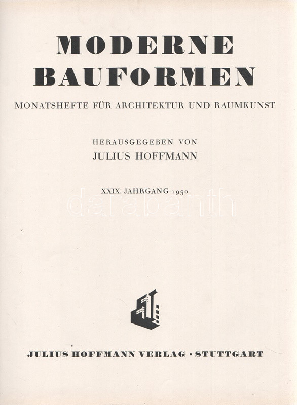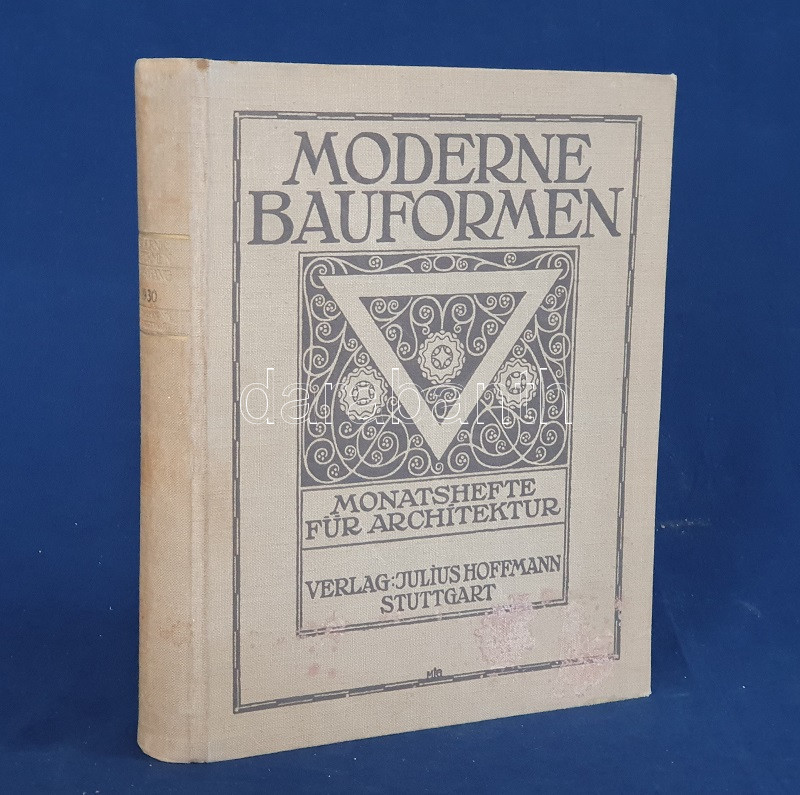 Moderne Bauformen. Monatshefte für Architektur und Raumkunst. Herausgegeben von Julius Hoffmann. XXIX. Jahrgang. [Teljes évfolyam, egybekötve.] (1930) Stuttgart, 1930. Verlag Julius Hoffmann (Druck der Hoffmanschen Buchdruckerei Felix Krais). X + [2] + 564 p. + 74 t. (49 színes, 15 kétoldalas). Julius Hoffmann modernista építészeti, belsőépítészeti, urbanisztikai és iparművészeti képes havi folyóirata 1902-1944 között jelent meg, oldalszámozáson belül rövidebb építészeti cikkekkel és igen gazdag fotóanyaggal. 1930. évi lapszámaink döntően a Bauhaus irányzatába sorolható megvalósított és megvalósításra váró terveket közöl, számos esetben alaprajzzal kiegészítve. A képanyag tekintélyes hányada épület-enteriőröket: lépcsőházakat, szalonokat, tágas, nap járta irodabelsőket, tárgyalókat, lakásbelsőket jelenít meg, időről időre városközpont-tervekkel, ipari és szórakoztatóipari tervekkel kiegészítve. Évfolyamunk lapszámaiban az idegenforgalmi tematika kimondottan erős. Az 1929-ben befejezett, egész háztömböt elfoglaló bochumi ,,Parkhotel Haus Rache" idegenforgalmi jelentőségéhez mért terjedelmet kap. A Ruhr-vidék egyik legdrágább szállodája a technikai megoldások legjavát kínálta, a jeles éjszakai lehetőségekkel bíró hotel art deco enteriőrjét számos felvétel örökíti meg. Ugyanezen év későbbi lapszáma a Halle an der Saale településén nyílt ,,Hotel Goldene Kugel" építészeti és belsőépítészeti részleteit taglalja. A két épületre azonos sors várt, a második világháborúban megsemmisültek. Fennmaradt és a mai napig is áll viszont az expresszionista építészet remeke, a gelsenkircheni Hans-Sachs-Haus, mely a városi adminisztrációnak ad otthont, valamint rendezvénytermeknek. A lapszámok beszámolnak továbbá a moszkvai modernista építészet fejleményeiről, Háy Gyula gazdagon illusztrált cikke pedig bemutatja Kozma Lajos kortárs kereskedelmi enteriőrjeit (Magyar Divatcsarnok, Budapest), illetve néhány vidéki, Bauhaus stílusban épült villáját. Aranyozott gerincű, illusztrált, enyhén foltos kiadói egészvászon kötésben. Jó példány.