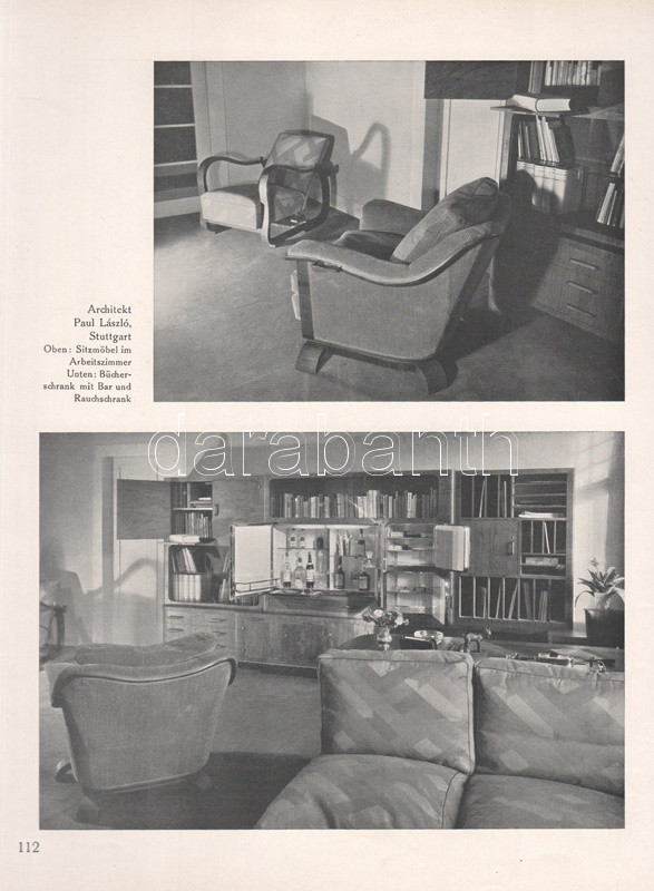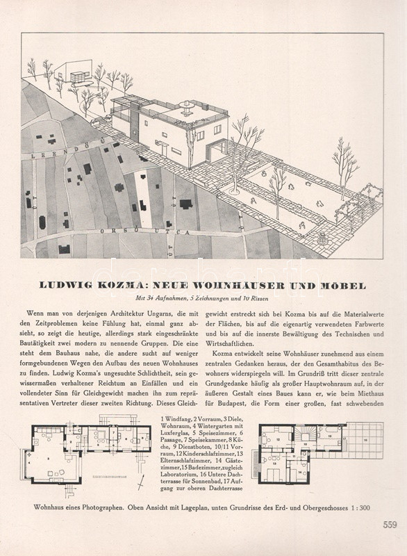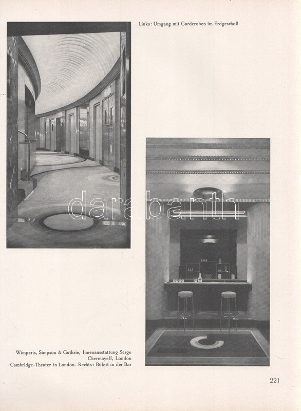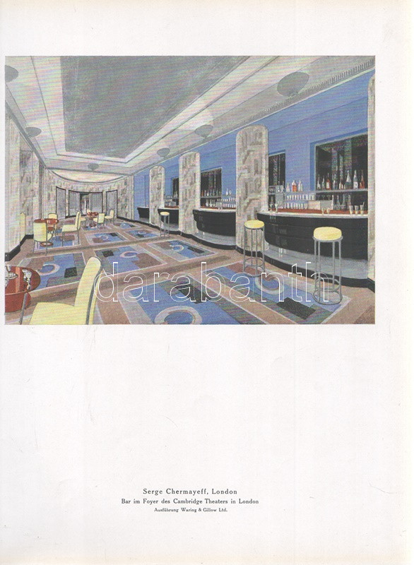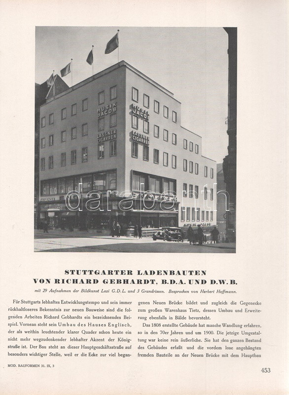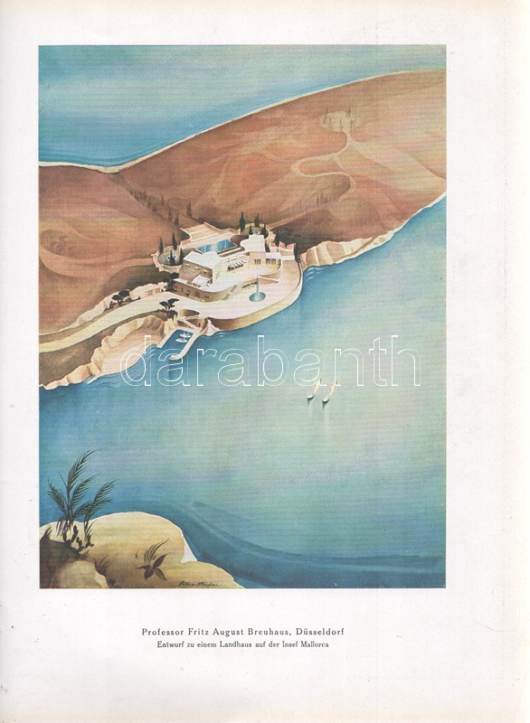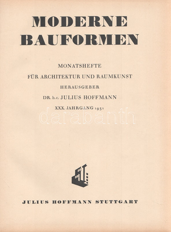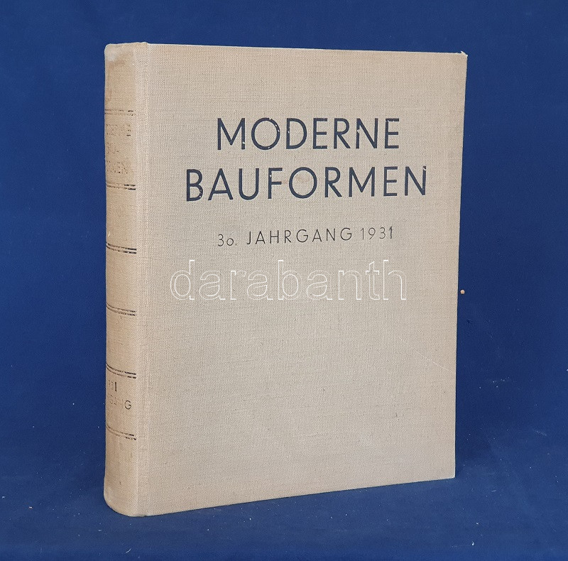 Moderne Bauformen. Monatshefte für Architektur und Raumkunst. Herausgegeben von Julius Hoffmann. XXX. Jahrgang. [Teljes évfolyam, egybekötve.] (1931) Stuttgart, 1931. Verlag Julius Hoffmann (Druck der Hoffmanschen Buchdruckerei Felix Krais)., XI + [1] + 635 + [1] p. + 46 p. (42 színes, 4 kétoldalas). Julius Hoffmann modernista építészeti, belsőépítészeti, urbanisztikai és bútorművészeti képes havi folyóirata 1902-1944 között jelent meg, oldalszámozáson belül rövidebb építészeti cikkekkel és igen gazdag fotóanyaggal. 1931. évi lapszámaink döntően a Bauhaus irányzatába sorolható megvalósított és megvalósításra váró terveket közöl, számos esetben alaprajzzal kiegészítve. A képanyag tekintélyes hányada épület-enteriőröket: lépcsőházakat, szalonokat, tágas, nap járta irodabelsőket, tárgyalókat, lakásbelsőket jelenít meg, időről időre városközpont-tervekkel, ipari és szórakoztatóipari tervekkel kiegészítve. Évfolyamunk talán az első a folyóirat történetében, amelyből eltűnnek a régi építészet sátortetős hagyományai, immár a bemutatott villák és udvarházak is túlnyomórészt a Bauhaus modernizmusának jegyében készülnek. A modernizmus jegyében rövidebb cikk születik a gyorséttermek építészetéről és belsőépítészetéről (berlini és los angelesi példákkal); modern lakóparkokat is láthatunk; bemutatkozik az új, art deco belsőépítészeti megoldásokat mutató épületbe költözött hamburgi Kunstverein kiállítótér; a hamburgi szórakoztatóipari komplexum: a mulatókat, éttermeket és hatalmas mozitermet magába foglaló Deutschlandhaus, éttermeivel és táncterével; bepillantást nyerünk az amszterdami Telegraaf szerkesztőségi épületének építészeti megoldásaiba (részletes keresztmetszeti és alaprajzzal); a nyomdának is helyet adó magdeburgi Zeitung-Hochhaus is bemutatkozik; Hajós Alfréd margitszigeti Nemzeti Uszodája is bemutatásra kerül, és csaknem teljes lapszám méltatja Kozma Lajos magyarországi villa- és belsőépítészetét. 25 levélen felül apró sérülés és szövegtükröt nem érintő hiány, néhány levélen és táblán apró szakadásnyom. Feliratozott kiadói egészvászon kötésben. Jó példány.
