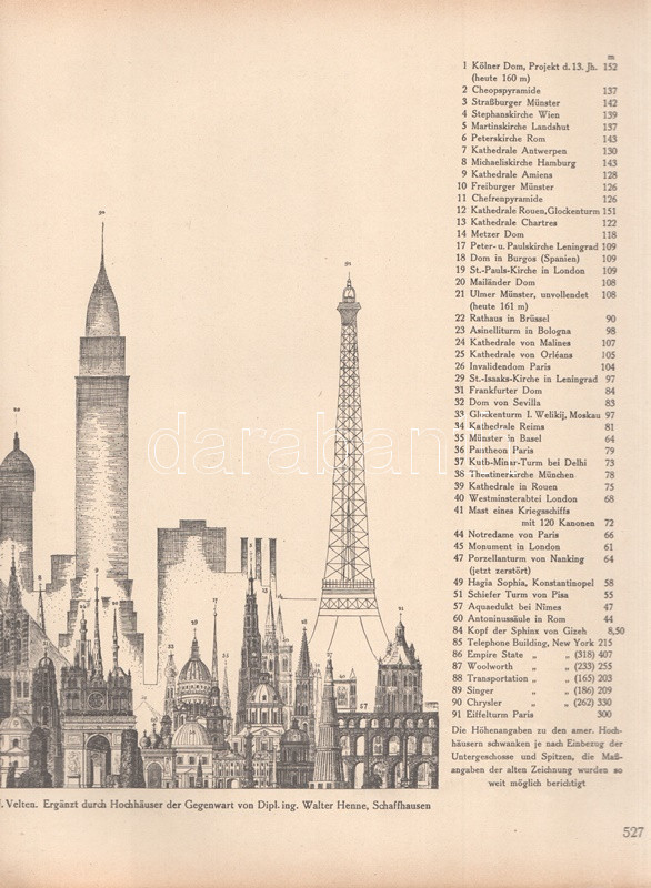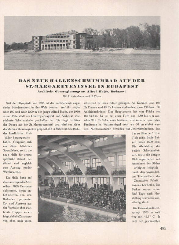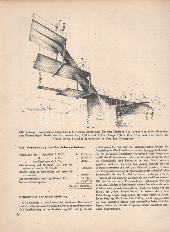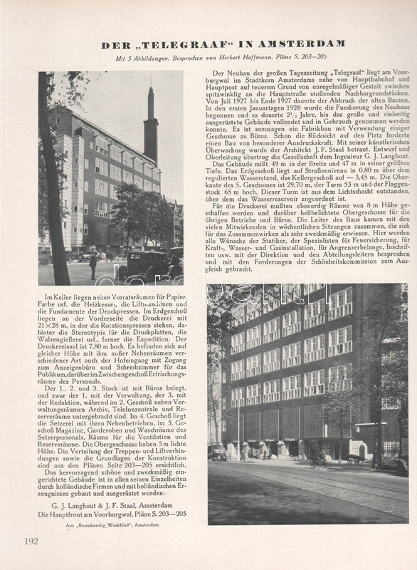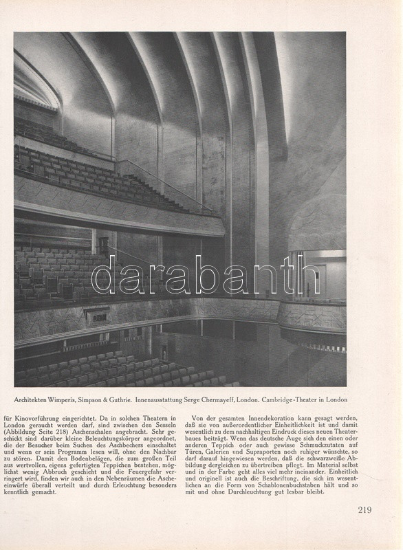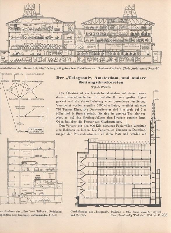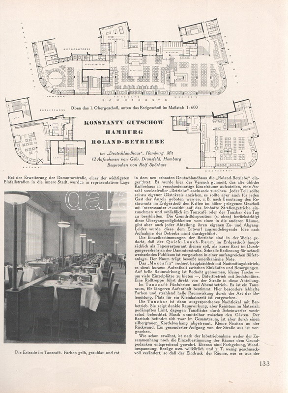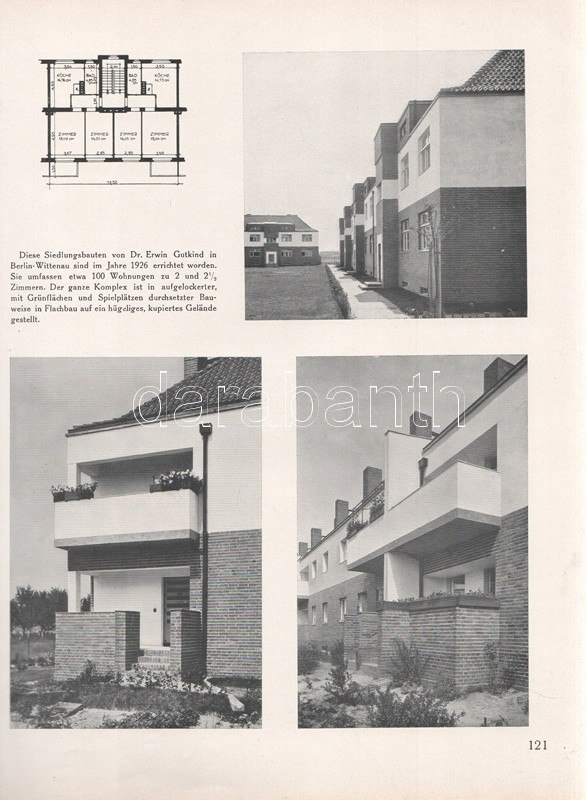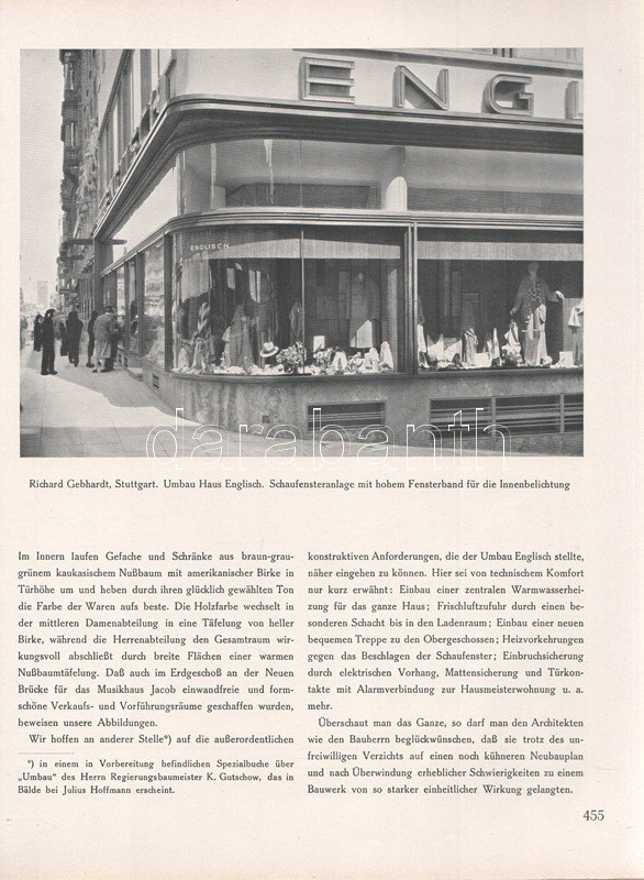 Moderne Bauformen. Monatshefte für Architektur und Raumkunst. Herausgegeben von Julius Hoffmann. XXX. Jahrgang. [Teljes évfolyam, egybekötve.] (1931) Stuttgart, 1931. Verlag Julius Hoffmann (Druck der Hoffmanschen Buchdruckerei Felix Krais)., XI + [1] + 635 + [1] p. + 46 p. (42 színes, 4 kétoldalas). Julius Hoffmann modernista építészeti, belsőépítészeti, urbanisztikai és bútorművészeti képes havi folyóirata 1902-1944 között jelent meg, oldalszámozáson belül rövidebb építészeti cikkekkel és igen gazdag fotóanyaggal. 1931. évi lapszámaink döntően a Bauhaus irányzatába sorolható megvalósított és megvalósításra váró terveket közöl, számos esetben alaprajzzal kiegészítve. A képanyag tekintélyes hányada épület-enteriőröket: lépcsőházakat, szalonokat, tágas, nap járta irodabelsőket, tárgyalókat, lakásbelsőket jelenít meg, időről időre városközpont-tervekkel, ipari és szórakoztatóipari tervekkel kiegészítve. Évfolyamunk talán az első a folyóirat történetében, amelyből eltűnnek a régi építészet sátortetős hagyományai, immár a bemutatott villák és udvarházak is túlnyomórészt a Bauhaus modernizmusának jegyében készülnek. A modernizmus jegyében rövidebb cikk születik a gyorséttermek építészetéről és belsőépítészetéről (berlini és los angelesi példákkal); modern lakóparkokat is láthatunk; bemutatkozik az új, art deco belsőépítészeti megoldásokat mutató épületbe költözött hamburgi Kunstverein kiállítótér; a hamburgi szórakoztatóipari komplexum: a mulatókat, éttermeket és hatalmas mozitermet magába foglaló Deutschlandhaus, éttermeivel és táncterével; bepillantást nyerünk az amszterdami Telegraaf szerkesztőségi épületének építészeti megoldásaiba (részletes keresztmetszeti és alaprajzzal); a nyomdának is helyet adó magdeburgi Zeitung-Hochhaus is bemutatkozik; Hajós Alfréd margitszigeti Nemzeti Uszodája is bemutatásra kerül, és csaknem teljes lapszám méltatja Kozma Lajos magyarországi villa- és belsőépítészetét. 25 levélen felül apró sérülés és szövegtükröt nem érintő hiány, néhány levélen és táblán apró szakadásnyom. Feliratozott kiadói egészvászon kötésben. Jó példány.