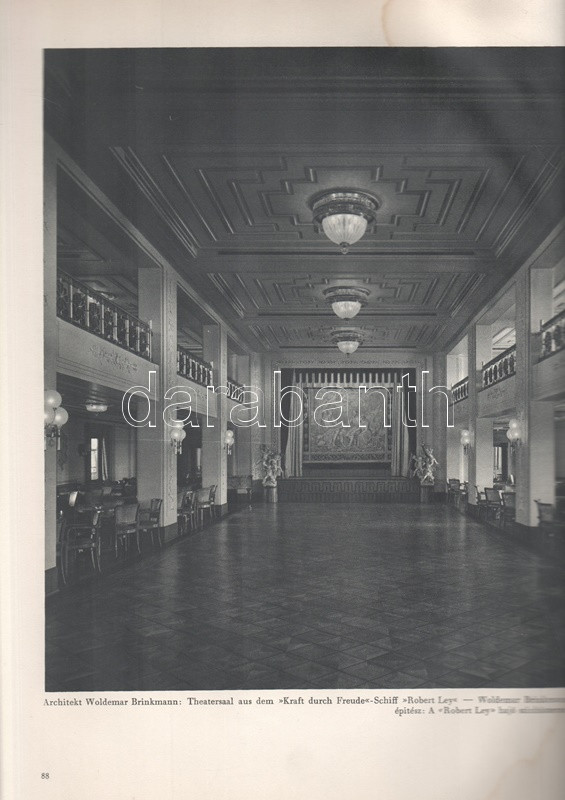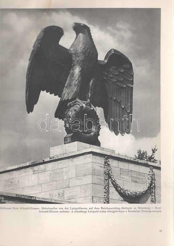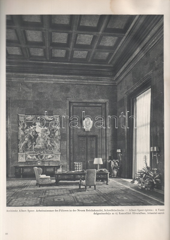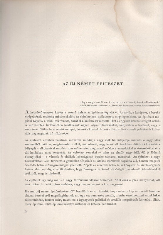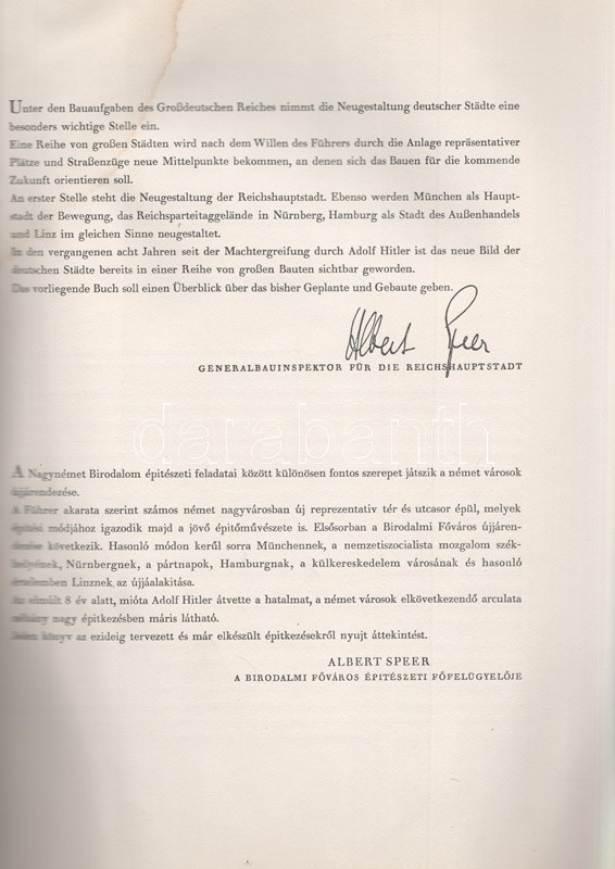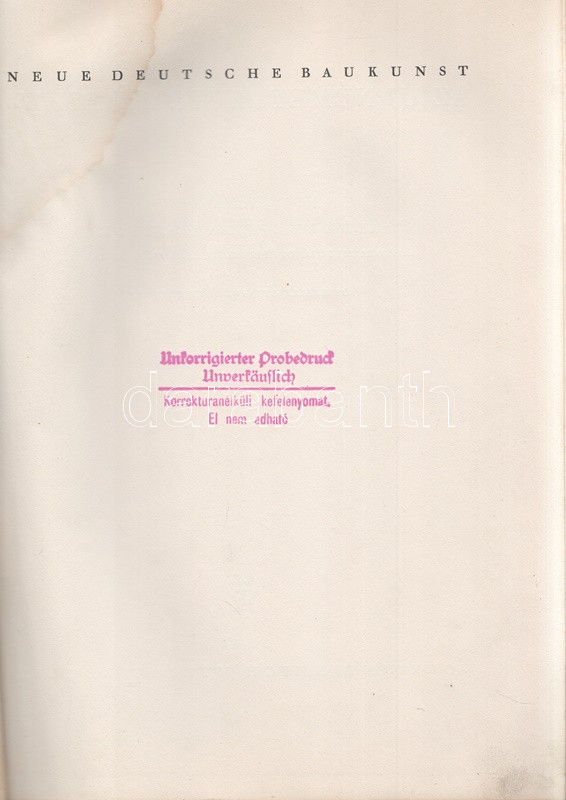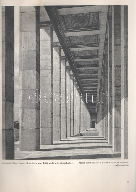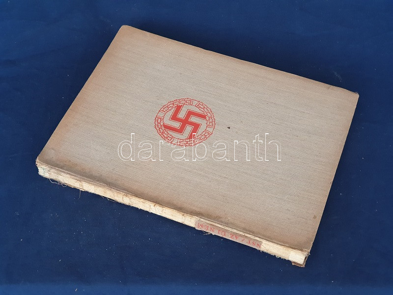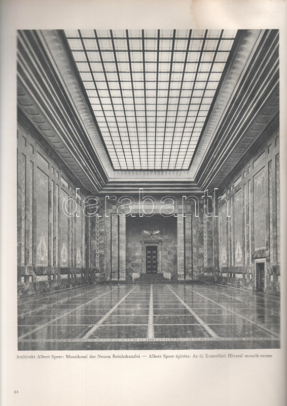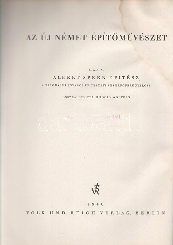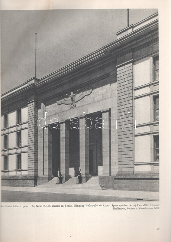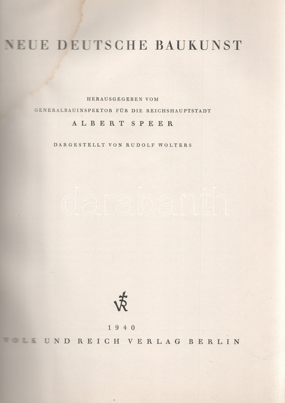 Speer, Albert (szerk.): Az új német építőművészet. Neue Deutsche Baukunst. (Korrektúranélküli kefelenyomat.) Berlin, 1940. Volk und Reich Verlag (Druck: Gebrüder Mann). 103 + [1] p. Az Albert Speer birodalmi főépítész és Rudolf Wolters által szerkesztett, német-magyar bilingvis építészeti album a totalitárius német állam monumentális építészeti motívumkincsébe nyújt betekintést, a 25. oldaltól egész oldalas fotóanyaggal, a fotóanyag alatt kétnyelvű képfeliratozással. A szigorú szimmetria és a monumentalitás iránti igény már a Weimari Köztársaság urbanisztikai törekvéseiben is tapasztalható volt, ám a nemzetiszocialista időkben a jelenség új szintre emelkedett. Példányunk első nyomtatott oldalán kiadói felülbélyegzés: ,,Unkorrigierter Probedruck - Korrektúranélküli kefelenyomat, El nem adható" felirattal. A kereskedelmi forgalomba nem került kötet - vélhetően ritkasága miatt - elkerülte a cenzorok figyelmét, így nem szerepel az Ideiglenes Nemzeti Kormány által 1945-ben betiltott könyvek jegyzékén. Példányunk levelein halvány foltosság. Babérkoszorúba foglalt szvasztikával díszített, hiányos gerincű, foltos kiadói egészvászon kötésben.