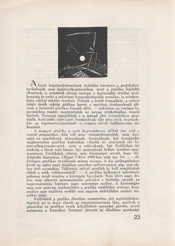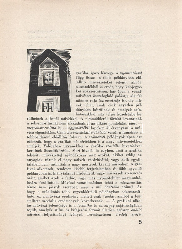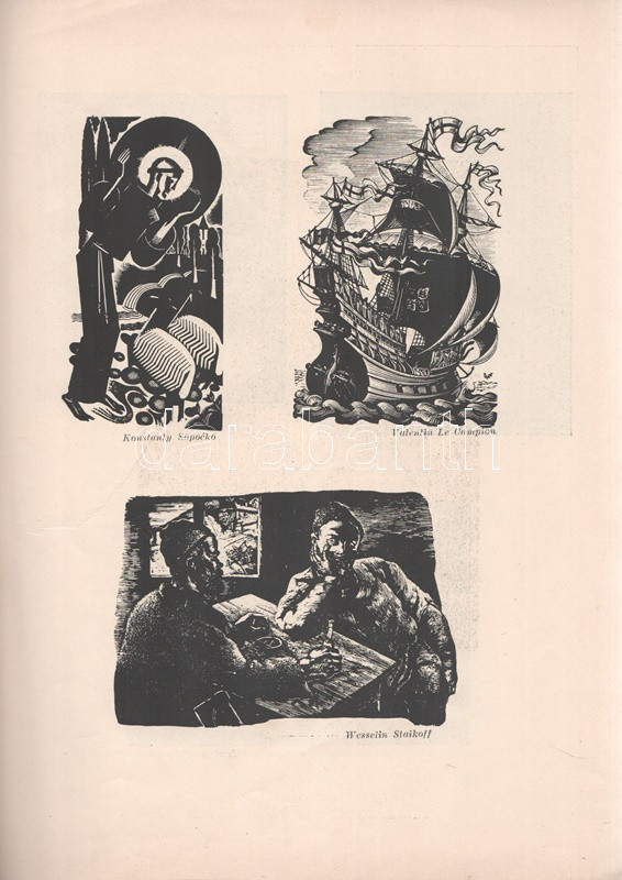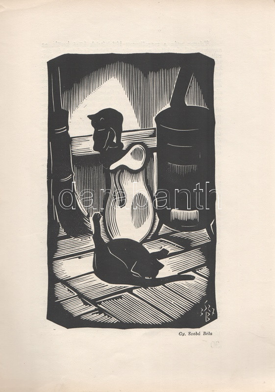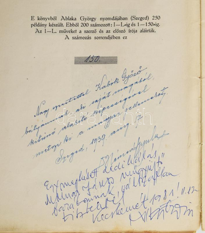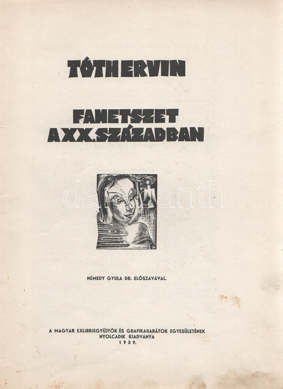 Tóth Ervin: Fametszet a XX. században. Némedy Gyula előszavával. (Számozott, kétszeresen dedikált.) [Budapest], 1939. MEGE (Ablaka György ny., Szeged). 40 + [2] p. + 5 t. (kétoldalas). Egyetlen kiadás. Tóth Ervin (1910-1999) művészettörténész tanulmánya a fametszés XX. századi hagyományait méltatja, oldalszámozáson belül számos magyar és külföldi grafikusművész - többek között Varga Nándor Lajos, Gáborjáni Szabó Kálmán, Gy. Szabó Béla, Molnár C. Pál, Buday György - munkáinak közzétételével. Kolofon: ,,E könyvből Ablaka György nyomdájában 250 példány készült. Ebből számozott: I-L-ig, és 1-150-ig. Az I-L. műveket a szerző és az előszó írója aláírták. A számozás sorrendjében ez a 150. [példány]". Dedikációk: Nagy szeretettel Kabók Győző bátyámnak, aki saját magából, kitűnő alakító képességével metszi ki a magyar jellemeket. Szeged, 1939. aug. 17". ,,Egy megkésett dedikálás Molnár János műgyűjtő barátomnak, változatlan tisztelettel. Kecskemét, 1981. II. 12. Tóth Ervin". Példányunk fűzése meglazult, a címoldalon foltosság. (A Magyar Exlibrisgyűjtők és Grafikabarátok Egyesületének nyolcadik kiadványa.) Prov.: Kabók Győző; Molnár János. [Kabók Győző (1881-1949) kabaré- és karakterszínész; Molnár János helytörténész, kecskeméti népművészeti és könyvgyűjtő, a kecskeméti Katona József Társaság vezetőségi tagja, számos magyar író, költő erdélyi úti kalauza, számos erdélyi költő, író kecskeméti házigazdája az 1960-1980-as években.] Fűzve, színes, illusztrált, sérült, foltos kiadói borítóban.