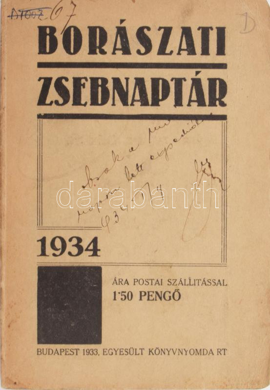 1934 Borászati Zsebnaptár az 1934. évre. 35. évfolyam. Szerk.: Baross Endre. Főmunkatár: Drucker György. Bp.,(1934.), Borászati Lapok, VII+1-132+VIII-IX+133-136+X-XI+137-176+XII-XIII+177-190+XIV-XVII p. Korabeli reklámokkal. Kiadói papírkötés, régi bélyegzésekkel, a borítón bejegyzéssel. XV+1-56+ XVI-XVII + 57-116 + XVIII-XXI+ 117-250+ XXII-XXIII+251-296+8+XXIV-XXXVIII p. Korabeli reklámokkal. Kiadói papírkötésben, régi intézményi bélyegzésekkel.