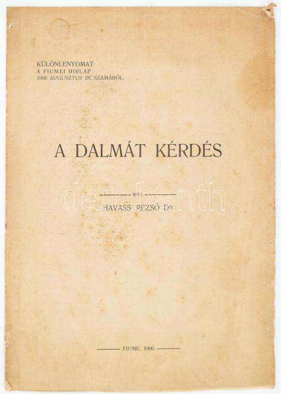 Havass Rezső: A dalmát kérdés. Különlenyomat a Fiumei Hírlap 1906. augusztus 28. számából. Fiume, 1906, (Hőnig E.-ny.), 7 p. Kiadói papírkötés, foltos, javított, felvágatlan.