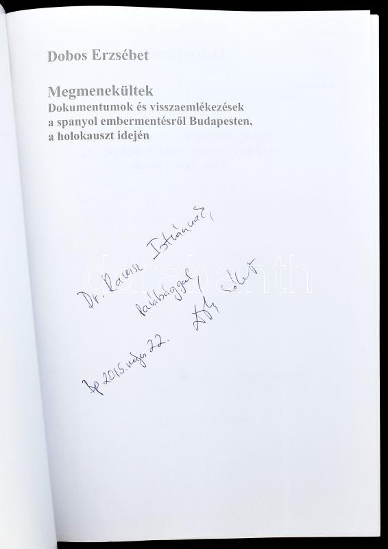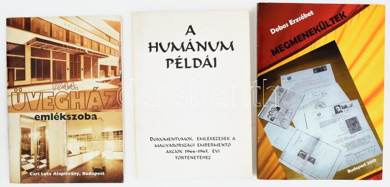 3 db judaika témájú könyv, kiadvány (közte egy dedikált): Dobos Erzsébet: Megmenekültek. Dokumentumok és visszaemlékezések a spanyol embermentésről Budapesten, a holokauszt idején. (Dedikált!) Bp., 2010, szerzői kiadás. Kiadói papírkötés. Megjelent 100 példányban. + A humánum példái. Dokumentumok, emlékezések a magyarországi embermentő akciók 1944-1945. évi történetéhez. Szerk. és a bevezető tanulmányt írta: Szita Szabolcs. Bp., 1998, Magyar Auschwitz Alapítvány - Holocaust Dokumentációs Központ. Kiadói papírkötés. + Üvegház emlékszoba 1944. (Kiállítási katalógus). Bp., é.n., Carl Lutz Alapítvány. Kiadói tűzött papírkötés.