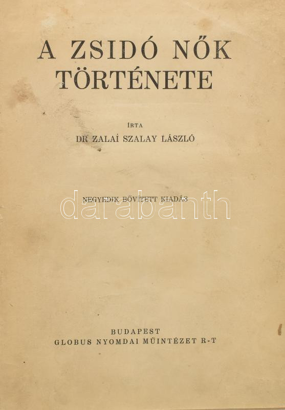 Dr. zalai Szalay László: A zsidó nők története. Hevesi Simon előszavával. Bp.,é.n., Globus, 355+1 p. Negyedik, bővített kiadás. Félvászon-kötés, kissé kopott gerinccel, laza kötéssel, laza és részben javított kötéssel, néhány nagyon kevés lap foltos, néhány kevés lapon ceruzás jegyzetekkel.