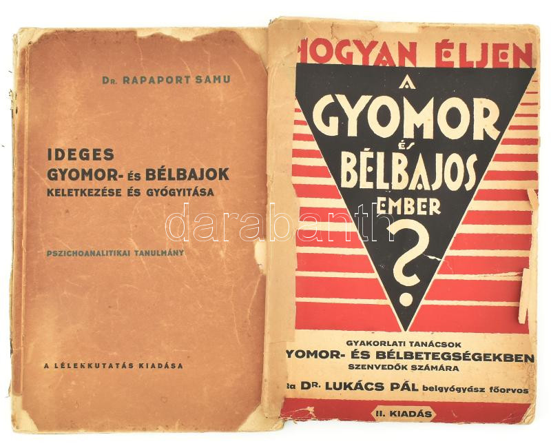 Lukács Pál: Hogyan éljen a gyomor- és bélbajos ember? Bp., én., Novák Rudolf. Kiadói papírkötés, sérült borítóval, javított gerinccel, a könyvtest elvált a borítótól, a könyvtest szétvált, és a lapok kijárnak, rossz állapotban. + Rapaport Samu: Ideges gyomor- és bélbajok keletkezése és gyógyítása. Pszichoanalitikai tanulmány. Bp., 1931, Lélekkutatás. Kiadói papírkötés, sérült borítóval és sérült, szétvált könyvtesttel, rossz állapotban.