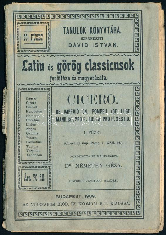 Latin és görög classicusok Cicero ford.: Németh Géza. Bp., 1909. Athenaeum. Tanulók könyvtára 64p. Papírborítóval, kissé szakadozott