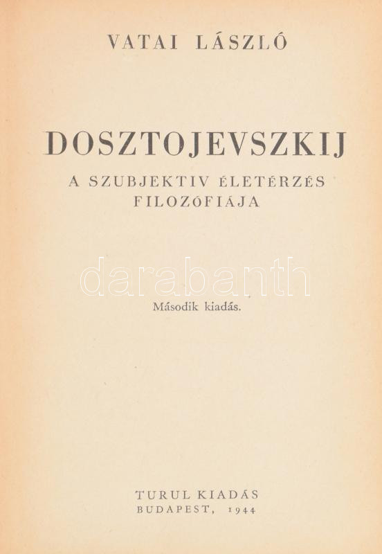 Vatai László: Dosztojevszkij. A szubjektív életérzés filozófiája. A Tá... https://www.darabanth.com/en/471-Online-auction/471.0/Books/Books-Other-rarities~1000037/Vatai-Laszlo-Dosztojevszkij-A-szubjektiv-eleterzes-filozofiaja-A-Tajekozodas-Konyvei~II3189487