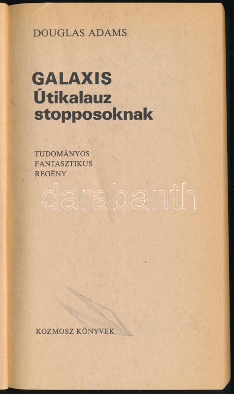 Douglas Adams: Galaxis útikalauz stopposoknak. Ford.: Molnár István. Kozmosz Fantasztikus Könyvek. Bp., 1987, Kozmosz Könyvek. ElsÅ‘ magyar kiadás. Kiadói papÃrkötés, kissé viseltes borÃtóval, az elÅ‘zéklapon ceruzás bejegyzésekkel.