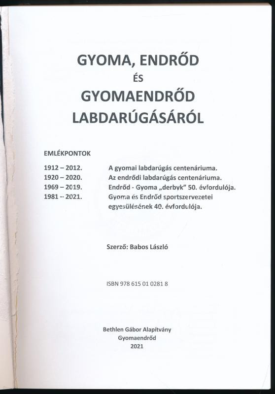 Babos László: Gyoma, Endrőd és Gyomaendrőd labdarúgásáról. A gyomaendrődi labdarúgás krónikája 1905-2020. Gyomaendrőd, 2021, Bethlen Gábor Alapítvány. Kiadói papírkötés, kissé sérült, ragasztott gerinccel.