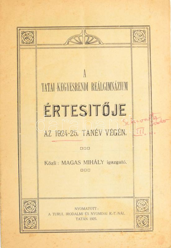 Description: A Tatai - Kegyesrendi Reálgimnázium értesítője az 1924-25. tanév végén. Közli: Magas Mihály. Tata, 1925, Turul, 30 p. Papírkötés, aláhúzásokkal és bejegyzésekkel, foltos.