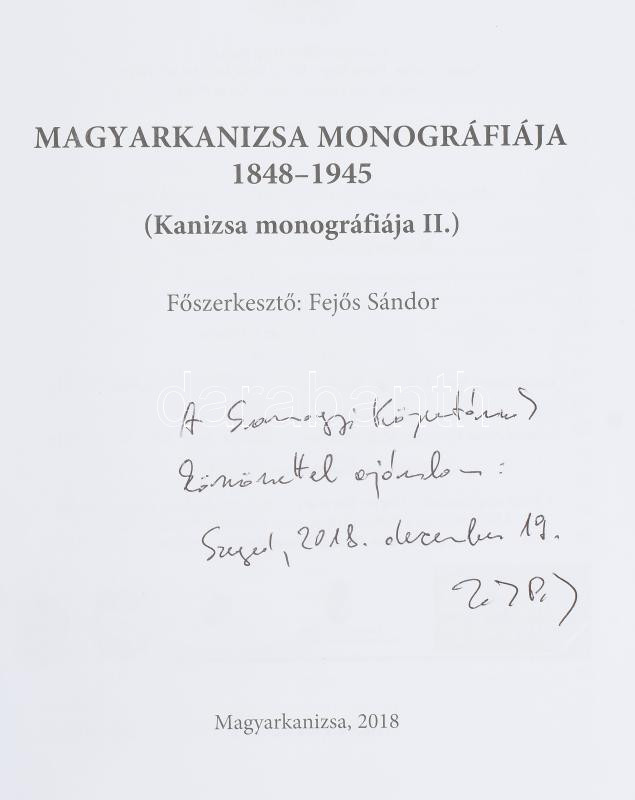 Description: Fejős Sándor (főszerk.): Magyarkanizsa monográfiája 1848-1945. (Kanizsa monográfiája II.) (Dedikált!) Magyarkanizsa, 2018, József Attila Könyvtár. Kiadói aranyozott műbőr-kötés, kiadói papír védőborítóban. A könyv egyik társszerzője és szerkesztője, Zakar Péter (1963- ) történész által dedikált példány.