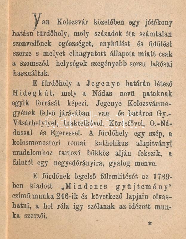 Hydrographus: A jegyenyei Hidegkút nevű gyógyfürdőnek népszerű ismertetése. Kolozsvár, 1875. 16p. Papírgerinccel