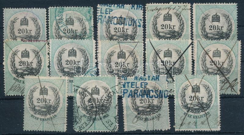 1897-1906 14 db 20kr okmánybélyeg fogazat és színeltérésekkel
