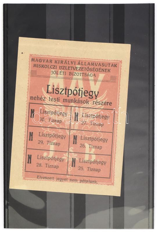 cca 1910 MÁV Lisztpótjegy nehéz testi munkások számára. kisív