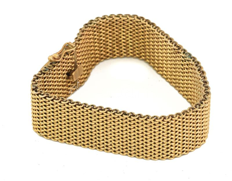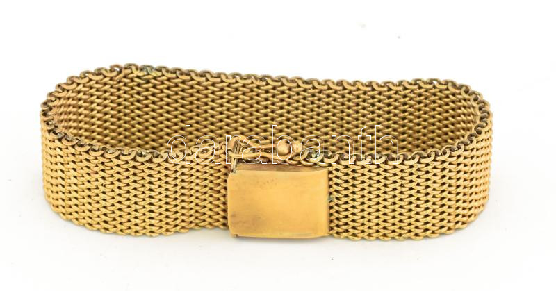 14K arany (Au) szövött mintás karlánc, jelzett 19 cm, 2 cm széles. Réz szál erősítéssel br 59 g
