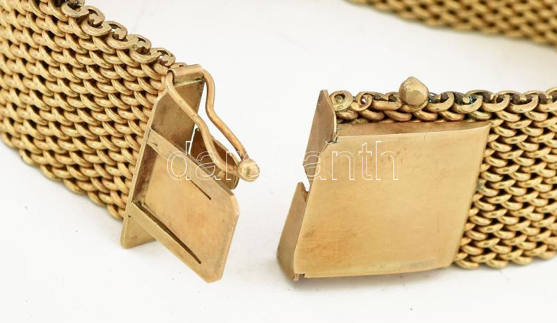https://www.darabanth.com/en/471-Online-auction/471.0/Jewellery-and-precious-metal-items/Jewellery-and-precious-metal-items~1000038/14K-arany-Au-szovott-mintas-karlanc-jelzett-19-cm-2-cm-szeles-Rez-szal-erositessel-br~II3139796