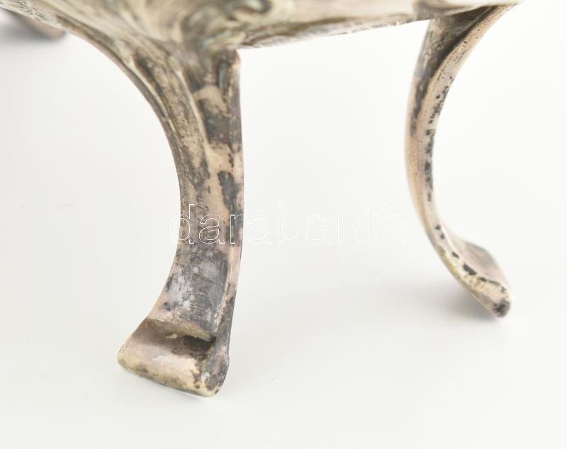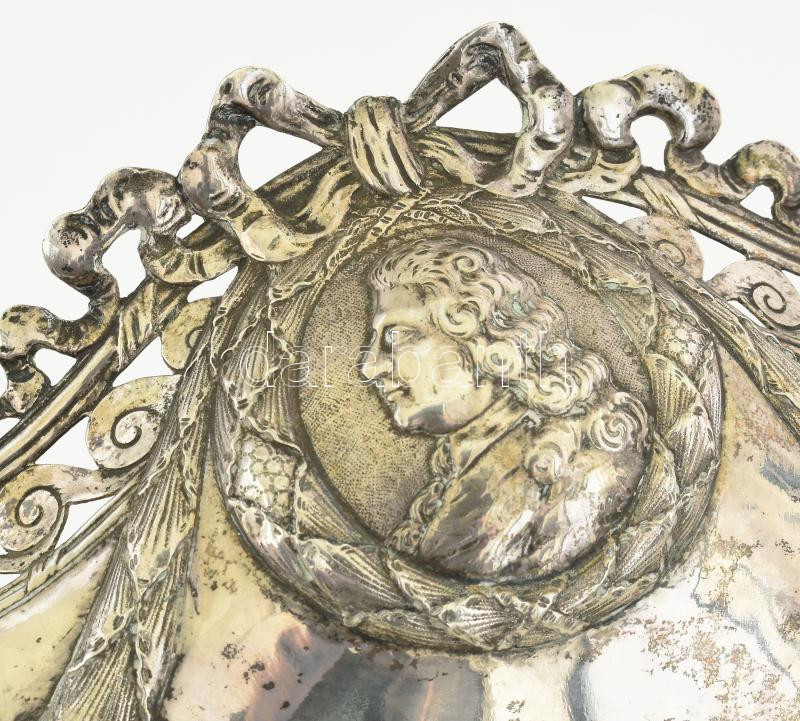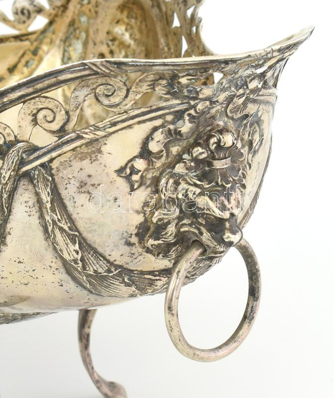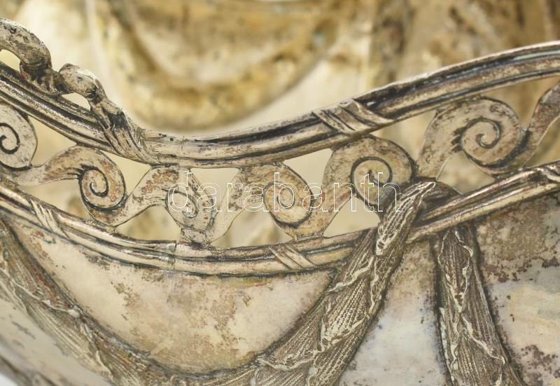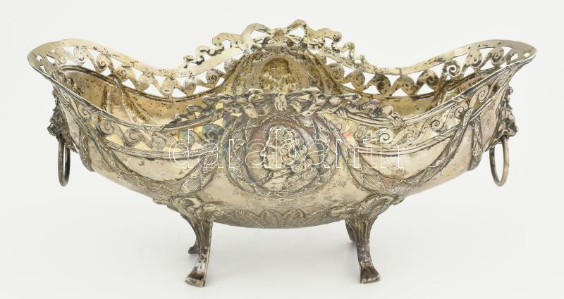 Description: Ezüst (Ag) aufsatz. Domborított, pereménél áttört szalagminta zárja. Két oldalán domborított férfi portré, két végén pedig karikát tartó oroszlánmaszk díszíti. Jelzett, pereménél kis repedéssel, 32x19x14 cm, nettó: 691 g