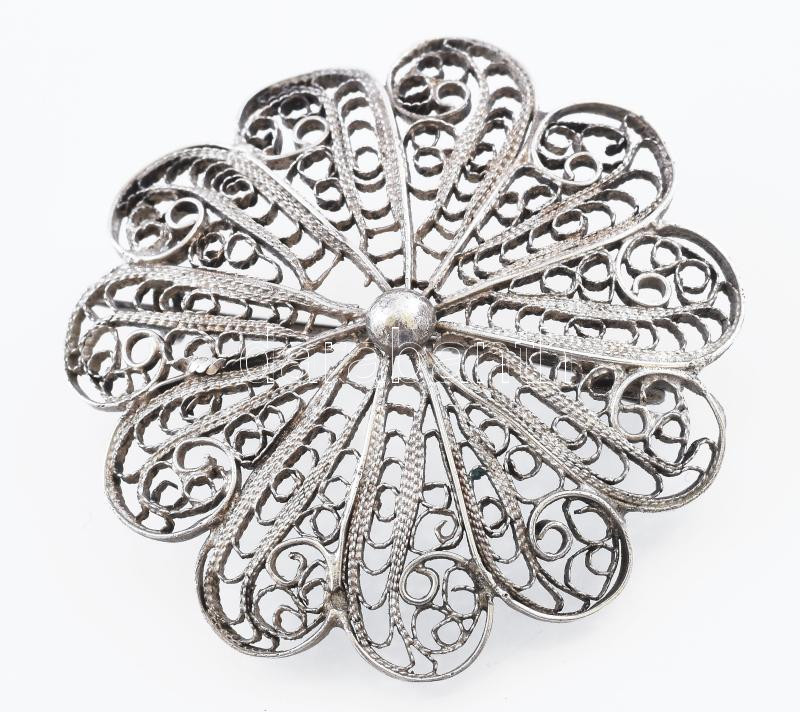 Ezüst (Ag) filigrán bross, jelzett, d: 4,3 cm, nettó: 7,9 g