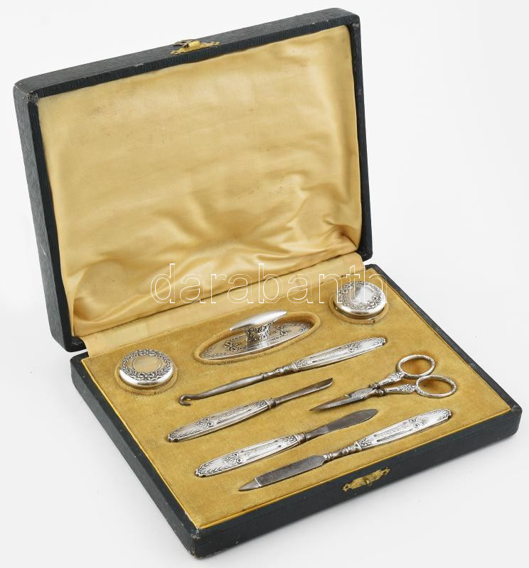 Ezüst (Ag) nyelű és borítású manikűr készlet ezüst (Ag) tégelyekkel, k...