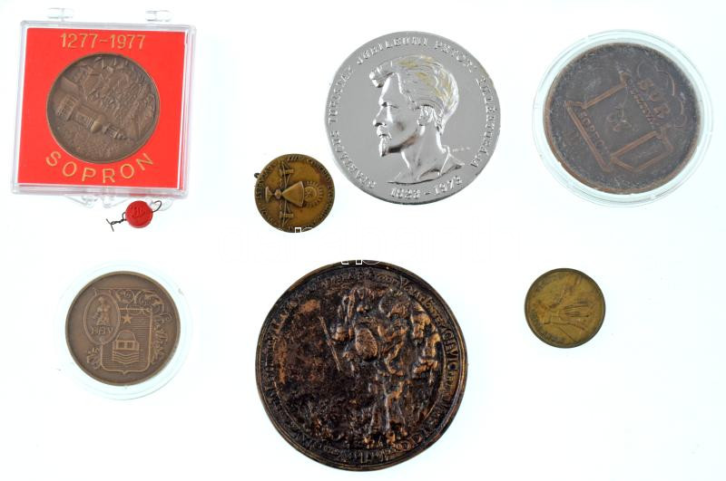 7db-os vegyes, főleg emlékéremből álló tétel, közte Somorjai László (1949-) 1977. "Sopron" bronz emlékérem Sopron szabad királyi várossá tételének 700. évfordulójára, eredeti, plombált ÁPV plasztiktokban (32mm) + 1987. "Sör Fesztivál Sopron / Soproni Ünnepi Hetek" kétoldalas bronz emlékérem (42,5mm) + DN "Lotharingiai Károly herceg hadműveletei Ibrahim pasa ellen. A győztes táti csata emlékére, 1685. augusztus 15-16" kétoldalas latin nyelvű emlékérem, öntött replika (58mm) + Madarassy Walter (1909-1994) 1938. "XXXIV. Nemzetközi Eucharisztikus Kongresszus Budapest" bronz jelvény hátoldalán "LUDVIG BP." gyártói jelzéssel, illetve "TÖRV. VÉD." jelzéssel (23mm) + Nagy-Britannia 1854. "Viktória királynő / Keep your temper" sárgaréz zseton T:vegyes