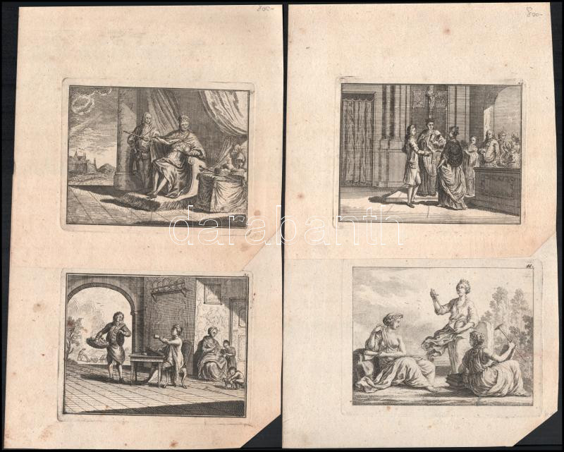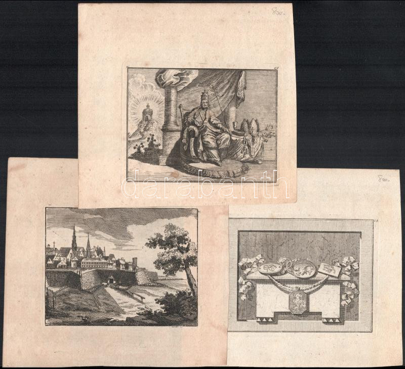 A klérus, a világi rendek, a házasság, a múzsák, erőd (stb.). 7 db rézmetszet, papír, jelzés nélkül. Feltehetően a Schauplatz d. Natur und Künste, (1776) c. könyvből, hátoldalán feliratozott. Néhány apró folttal. Jobb alsó sarkában és a lap széle részben vágott, 10x13 cm k. méretben.