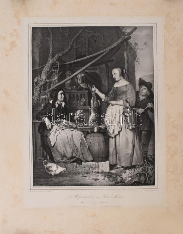 Gabriel Metsu (1629-1667): Die Wildbrethändlerin [A vadhúskereskedőnő], litográfia, papír, Dresden, Königliche Gemälde - Galerie, Hrsg. Franz Hanfstaengl, foltos, a szélén kis szakadással, kis lyukkal, 44x34 cm, teljes: 67x51 cm