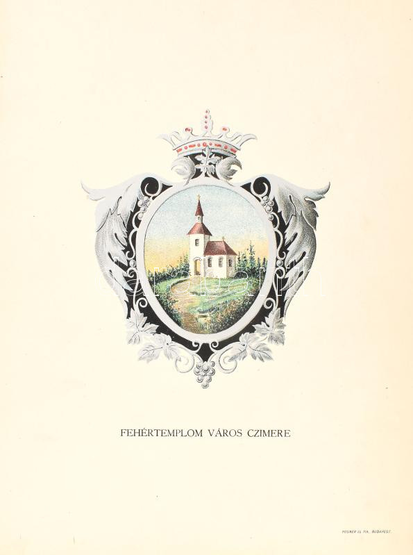 cca 1900 Fehértemplom ( Bela Crkva, németül Weißkirchen, románul Biserica Alba Serbia) címere. Litografált címerrajz 14x16 cm, lap 25x35 cm