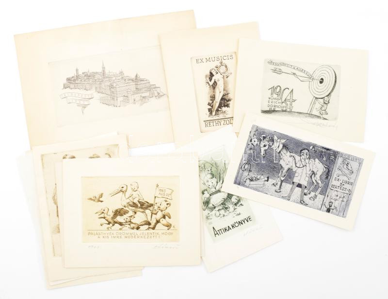 10 db vegyes ex libris, kisgrafika, alkalmi grafika, klf. alkotók (Kékesi László, Kaveczky Zoltán, Gácsi Mihály, stb.), közte Budai Vár, erotikus ex libris, stb. Rézkarc, papír, többségében jelzettek, változó méretben.