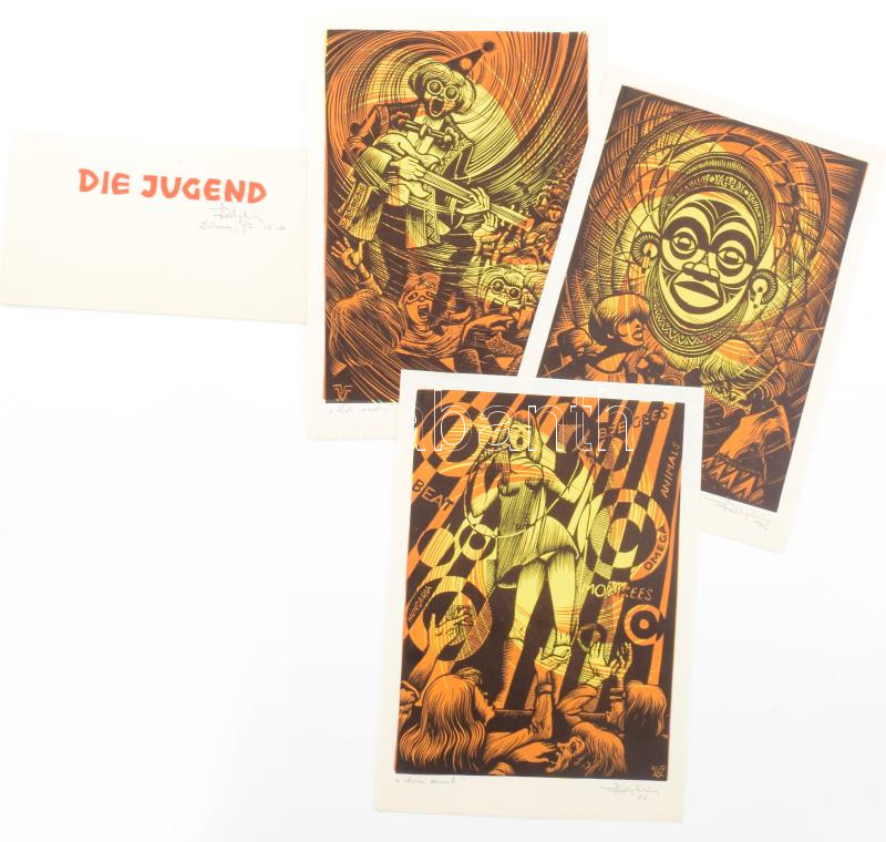 Várkonyi Károly (1910-2001): ,,Die Jugend", 3 db mű: ,,Der Clown", ,,Dzsungel tánca", ,,Mini Kunst". Linómetszet, papír, jelzettek, 21x15 cm.