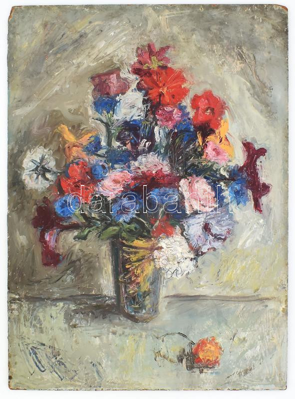 https://www.darabanth.com/en/471-Online-auction/471.0/Paintings-and-graphics/Paintings-and-graphics-quot-signedquot-or-quot-without-signquot-~500002/Jelzes-nelkul-Szines-csokor-Olaj-farost-sarkaiban-kisse-serult-43C39731-5-cm~II3190036