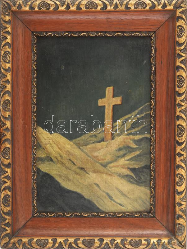 Jelzés nélkül, XX. sz. eleje: Hegyi kereszt. Olaj, vászon. Antik, dekoratív fakeretben, vakrámán Meer Mór és Fia aradi művészellátó bélyegzőjével. 30×20 cm.