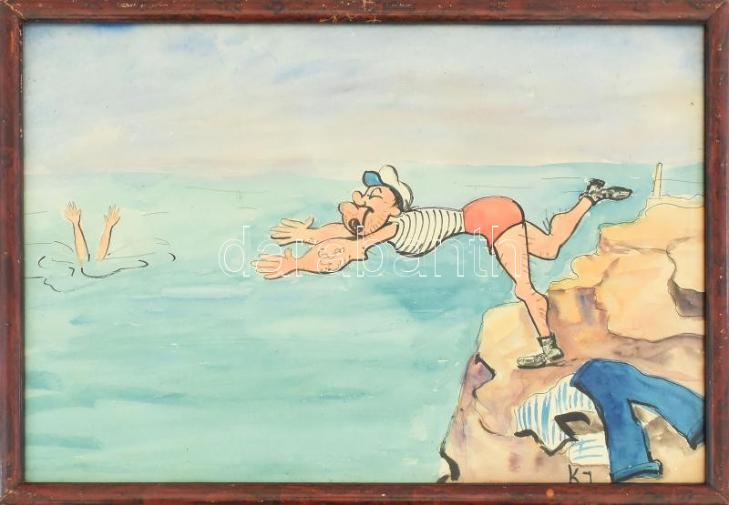 KJ jelzéssel, XX. sz. közepe: Popeye vízbe ugrik. Akvarell, papír. 26x37 cm. Üvegezett fakeretben.