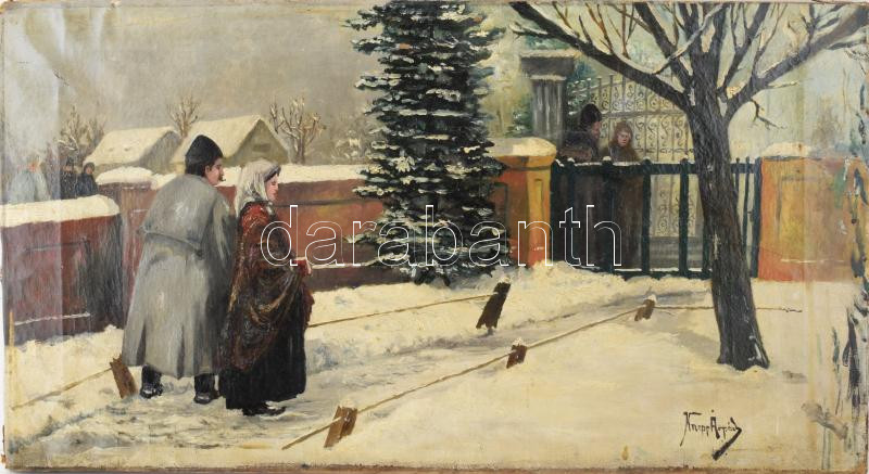 Knopp Árpád jelzéssel, XX. sz. eleje: Séta a hóban. Olaj, vászon. Sérü...