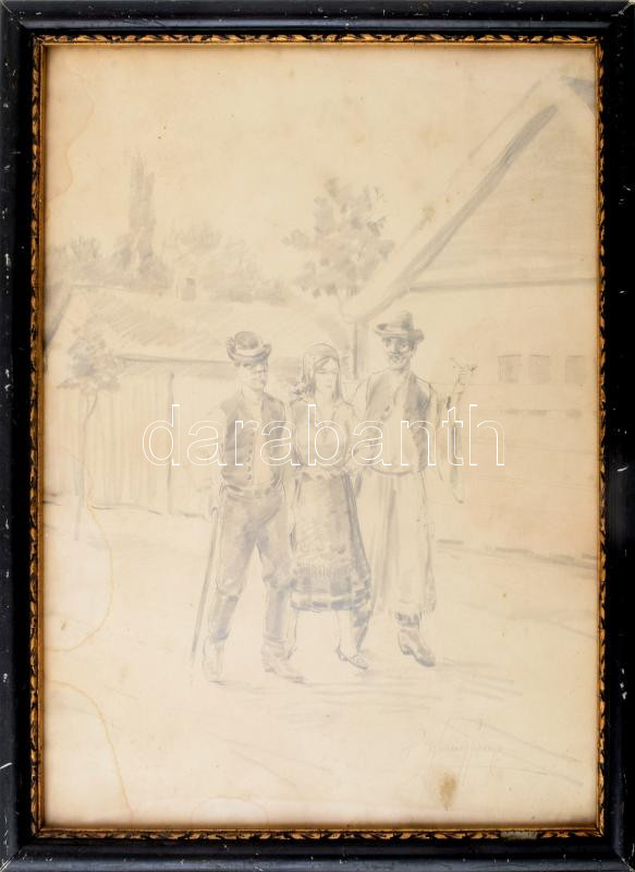 Olvashatatlan jelzéssel (Klucsik Ferenc?): Menyecske férfiakkal. Ceruza, papír, üvegezett fakeretben, 34×25 cm