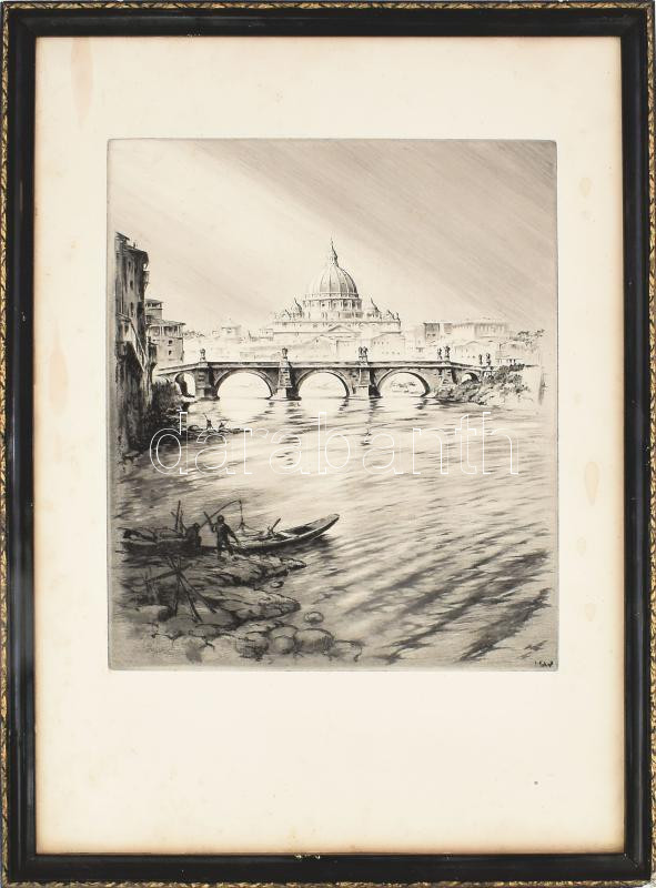 Olvashatatlan jelzéssel a dúcon: Ponte Sant'Angelo, Róma, háttérben a Szent Péter bazilika. Rézkarc, papír. Lap széle foltos. 32x26 cm. Dekoratív, jobb alsó sarkában sérült fakeretben.