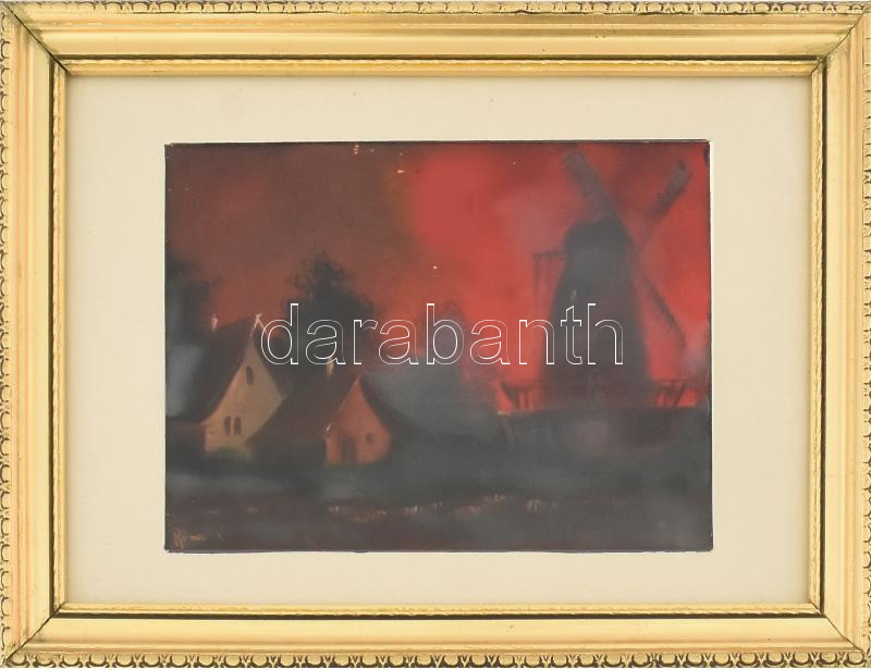 Róna V jelzéssel: Táj szélmalommal. Olaj, karton. Üvegezett fakeretben...
