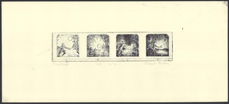 Albert Farkas (-): Naplopó, 2001. Rézkarc, papír, jelzett, művészpéldány E/A II/3 számozással. Lapszéli kisebb elszíneződésekkel. 5x20,5 cm