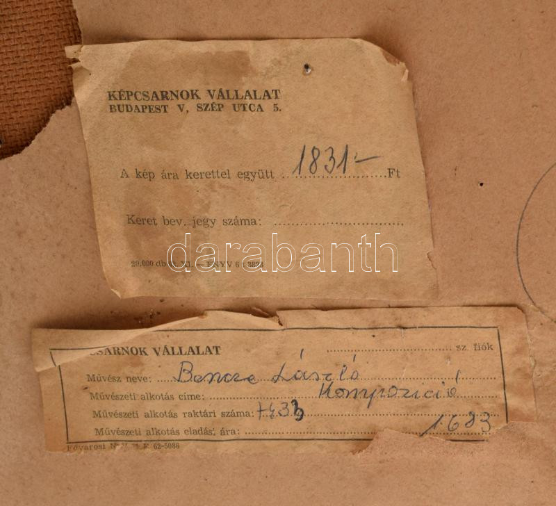 https://www.darabanth.com/en/471-Online-auction/471.0/Paintings-and-graphics/Paintings-and-graphics~500001/Bencze-Laszlo-1907-1992-Kompzicio-Olaj-farost-jelezve-balra-lent-Hatoldalan-Kepcsarnok~II3186767