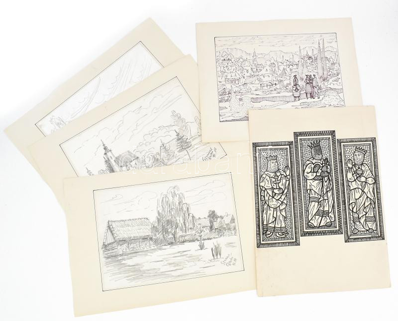 Description: Durkó Gábor (1916-2003), össz. 5 db mű: Háromkirályok és tájképek (Mosdós, Szenna,), 1984-1996. Ceruza, tus, filctoll, papír, mindegyik jelzett. Lapméret: 30x42 cm. Háromkirályok apró lapszéli szakadással.