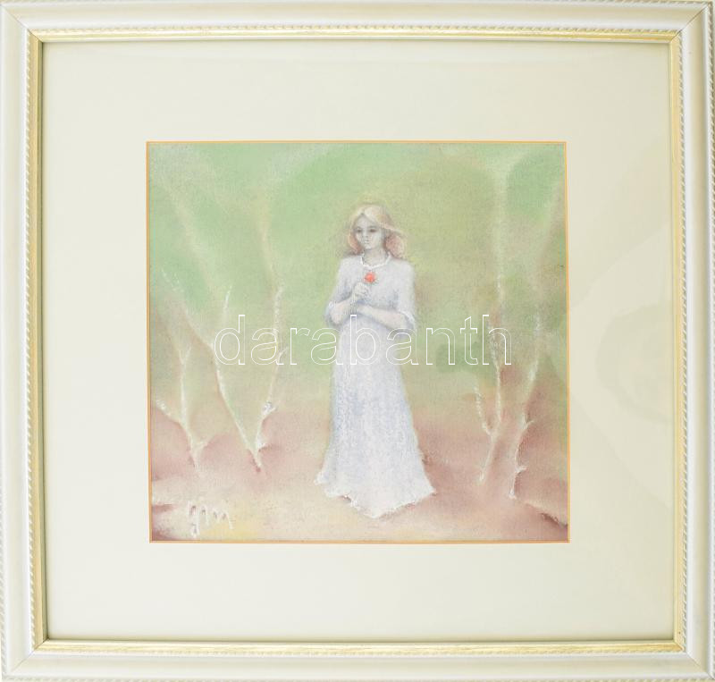 Gonda Margit (?-): Lány a tájban. Akvarell, papír, dekoratív keretben ...