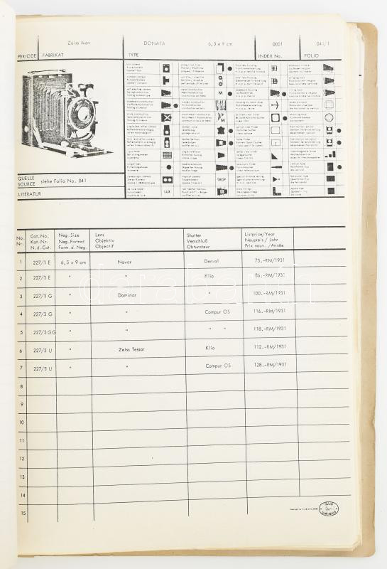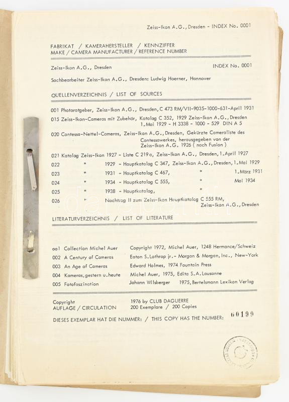 1978 Zeiss - Ikon A. G. Dresden Index No. 0001. Zeiss - Ikon fényképezőgépekről kiadott izgalmas, rengeteg adattal ellátott kiadványának másolata, feliratozott mappában.