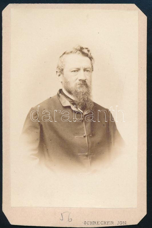 1865 Podhorszky Lajos (1815-1891) nyelvész, az 1848/49-es forradalom és szabadságharc résztvevője (leverését követően Szerbiába menekült, később Párizsban telepedett le), az MTA levelező tagja; vizitkártya Schrecker Ignác (1834-1888) pesti műterméből, sarkai vágottak, 9,5x6 cm