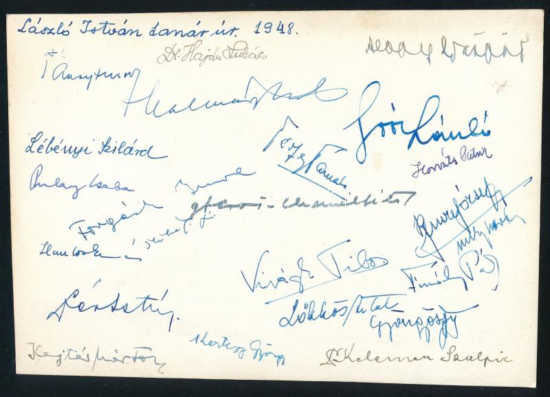 Description: 1948 A Pannonhalmi Szent Benedek-rendi Katolikus Dante-Gimnázium VIII. o. végzett növendékei, 1940-1948, tablófotó, hátoldalán aláírásokkal (közte Dr. Hajdu Lukács igazgató), 16,5x11,5 cm