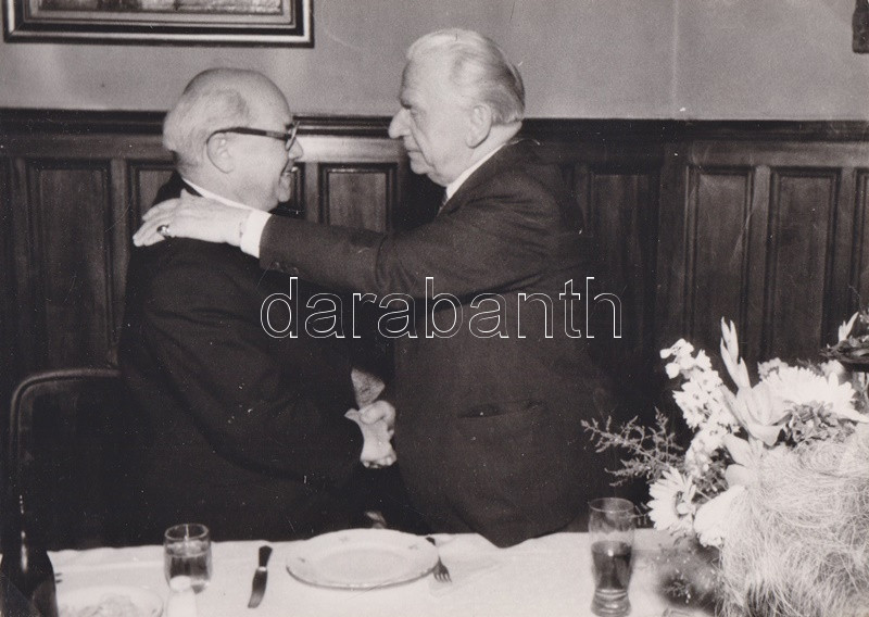 Kisfaludi Strobl Zsigmond (1884-1975) szobrászművész és Ék Sándor (1902-1975) Kossuth-díjas festő, grafikus közös fényképe a Fészek klubban, Kisfaludi Strobl nyolcvanadik születésnapjának ünnepélyén. Dolezsál László felvétele, 1964. Vintázs, zselatinos ezüst nagyítás, mérete: 130x181 mm. Hátoldalán Dolezsál László műtermi bélyegzései, valamint kézzel írt megjegyzések a kép készítésével kapcsolatban. Kisfaludy Strobl Zsigmond 1948-tól haláláig a Fészek Művészklub elnöke volt. Ék Sándor bécsi, majd moszkvai emigráns baloldali festő, 1948-ban az Iparművészeti Múzeum igazgatója, 1949-től a Magyar Képzőművészeti Főiskola grafikai tanszékvezető tanára. Dolezsál László sajtófotós, a Film, Színház, Muzsika, majd a Képes Újság munkatársa. Jó állapotú lap, paszpartuban.