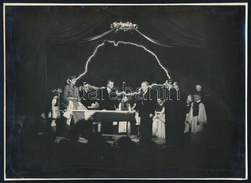 Színházi előadás a történelmi Magyarország irredenta jelképével a háttérben, fotó, felületén törésnyomok, 23×17 cm