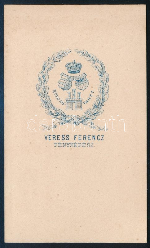 cca 1855-60 Fiatal, előkelő, férfi portréja ritka díszletben, érdekes agancsokból épített székben, lábánál is agancsokkal, feltehetően egy vadász, keményhátú fotó Veress Ferenc kolozsvári műterméből, érdekes magyar-erdélyi címeres hátlappal, korai erdélyi cdv, jó állapotban, 10,5x6 cm