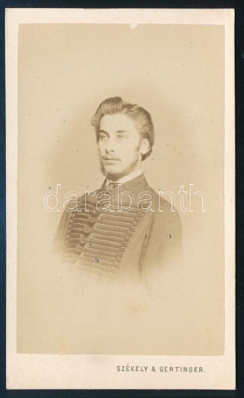 Description: cca 1862-64 Előkelő fiatal férfi, feltehetően magyar nemes portréja, vizitkártya J. Székely (Székely József, 1838-1901) és J. Gertinger bécsi műterméből, kissé kopott, 10,5x6,5 cm