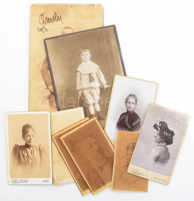 cca 1865-1870 - 1900 Vegyes keményhátú fotó tétel, 9 db, közte 3 db műterem nélküli fotó, katonaportré Strelisky műterméből, Müller L. Debreczen, Petrozsény, If. Joánovits és Sternád, J. Dajkovits Werschetz (Versec), Budapest Elbl és Pietsch, Temesvár Kossak József. Változó állapotban, közte foltos, 20x11 cm és 10x6 cm közötti méretben.