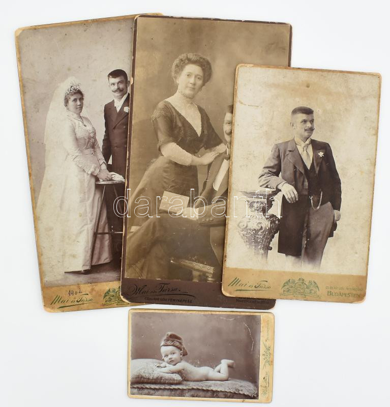cca 1890-1910 Mai és Társa portré fotók, 4 db: közte úriember portré fiatalúrként, esküvőn, és idősebben a feleségével, valamint egy sapkás csecsemő fotója, keményhátú fotók Mai és Társa műterméből, közte foltosak, az egyik verzója sérült, 6x10 cm és 20x11 cm közötti méretben